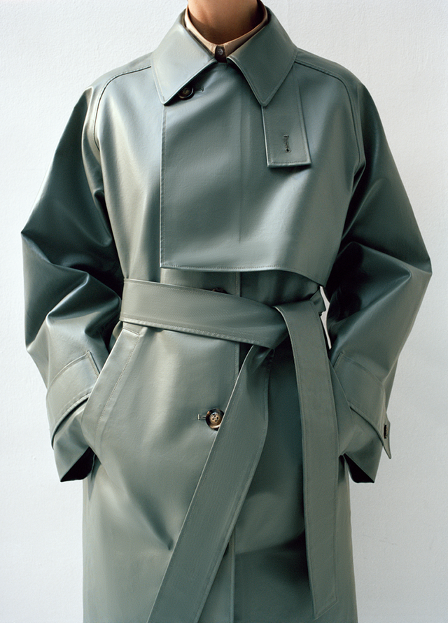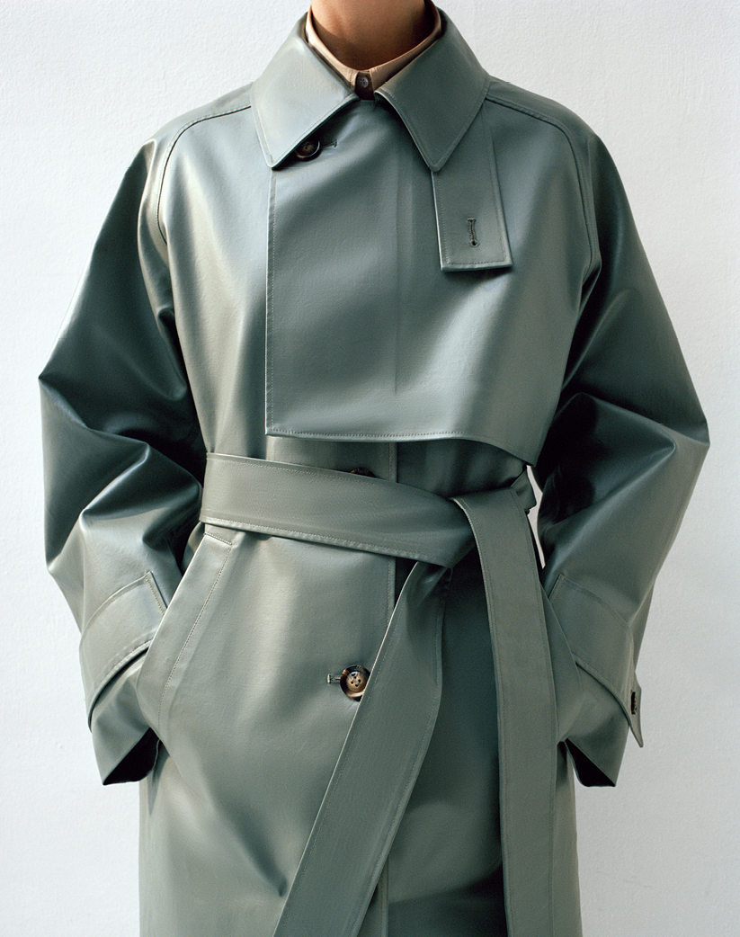 The trench coat is reinvented. Asymmetry, lustrous coated fabric, and pastel grey mixed with green: a mid-season piece with timeless allure.
