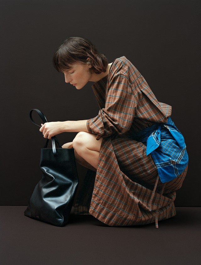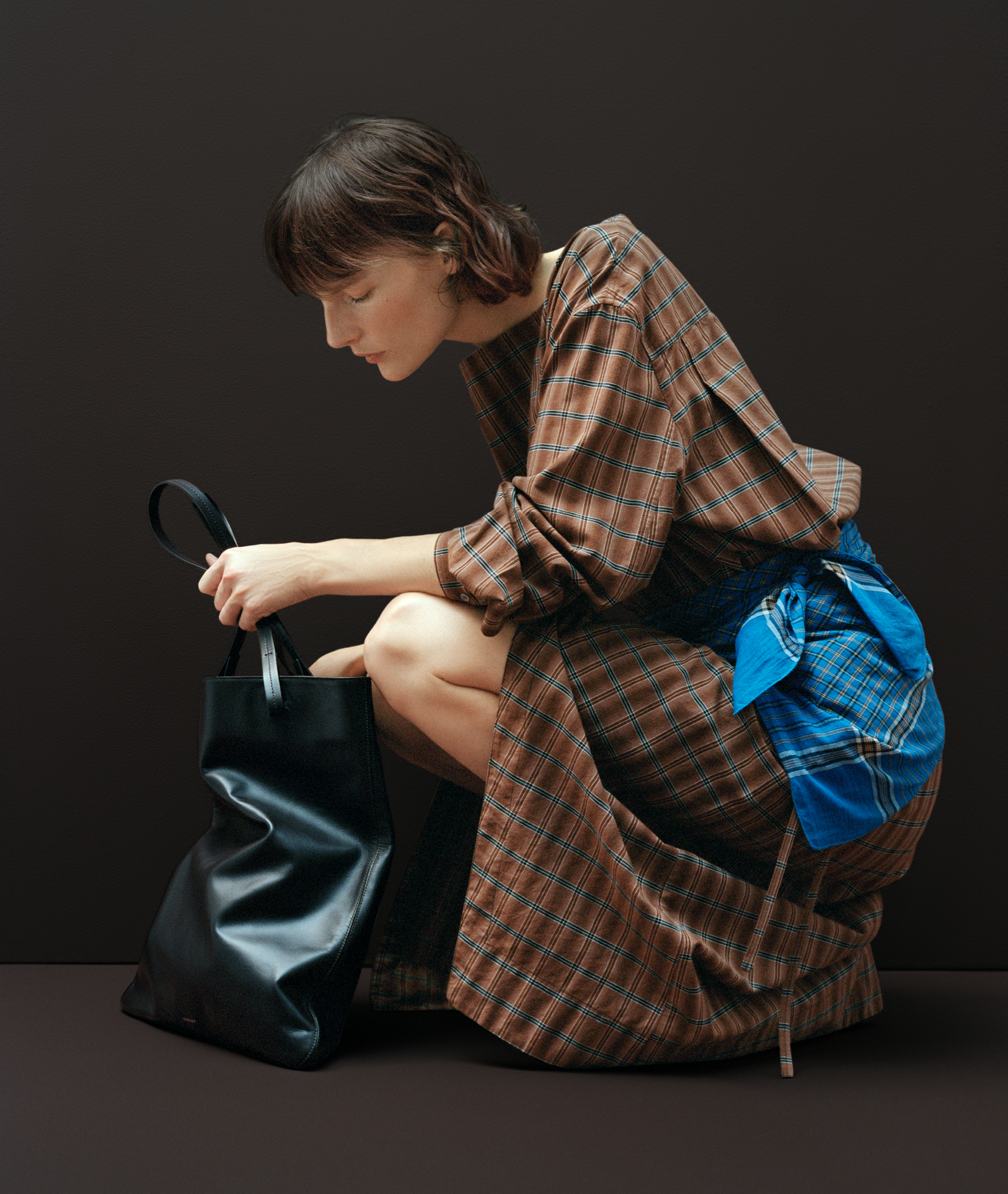 An elegant asymmetrical seam, a soft pastel oscillating between sage and putty: our new bucket bag for a new season.