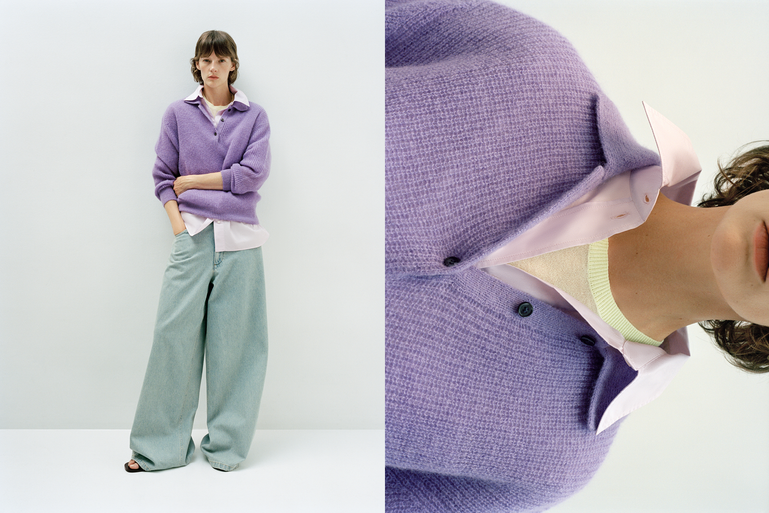 Layering as a signature: between knits of varying thicknesses and acid colours, the harmony of the palette meets the multitude of materials.