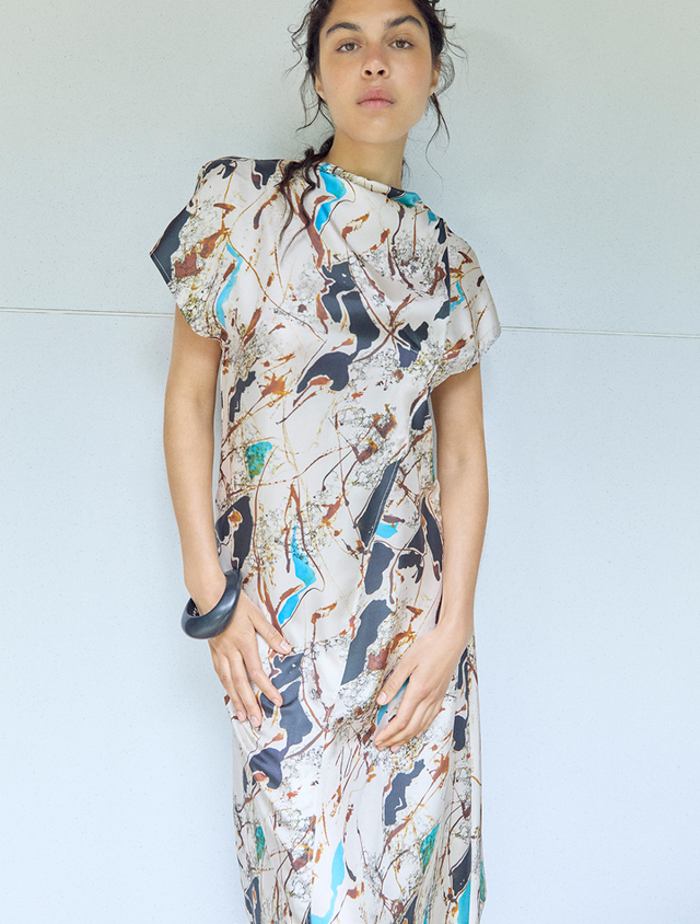 The silhouette suggests rather than exclaims, elegantly displaying the lines of a draped outfit, the volume of trousers animated by the summer breeze, the abstraction of a print, the brilliance of icy blue silk.