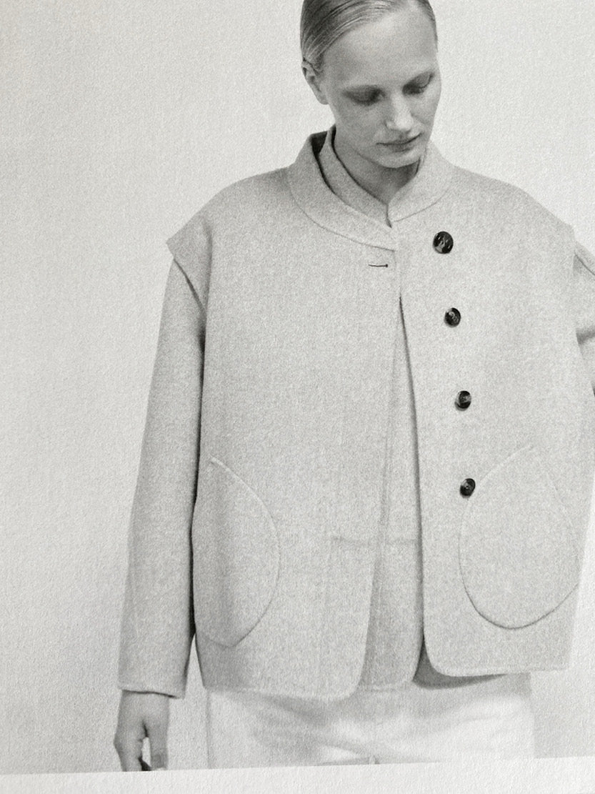 Flexible and reversible, this double-sided garment can be worn as a jumper or coat depending on the season. Two plain fabrics envelop the body in a soft, sophisticated and comfortable material, designed to last throughout the seasons.