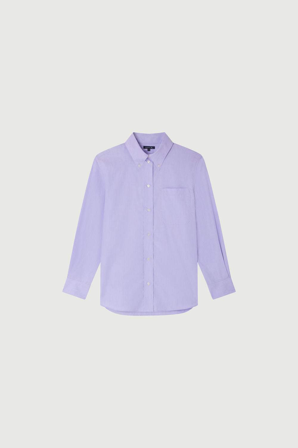 MARIA is a cotton poplin shirt. It features a men's style collar, a buttoned front opening, a chest patch pocket, and a shirttail hem for a modern touch.