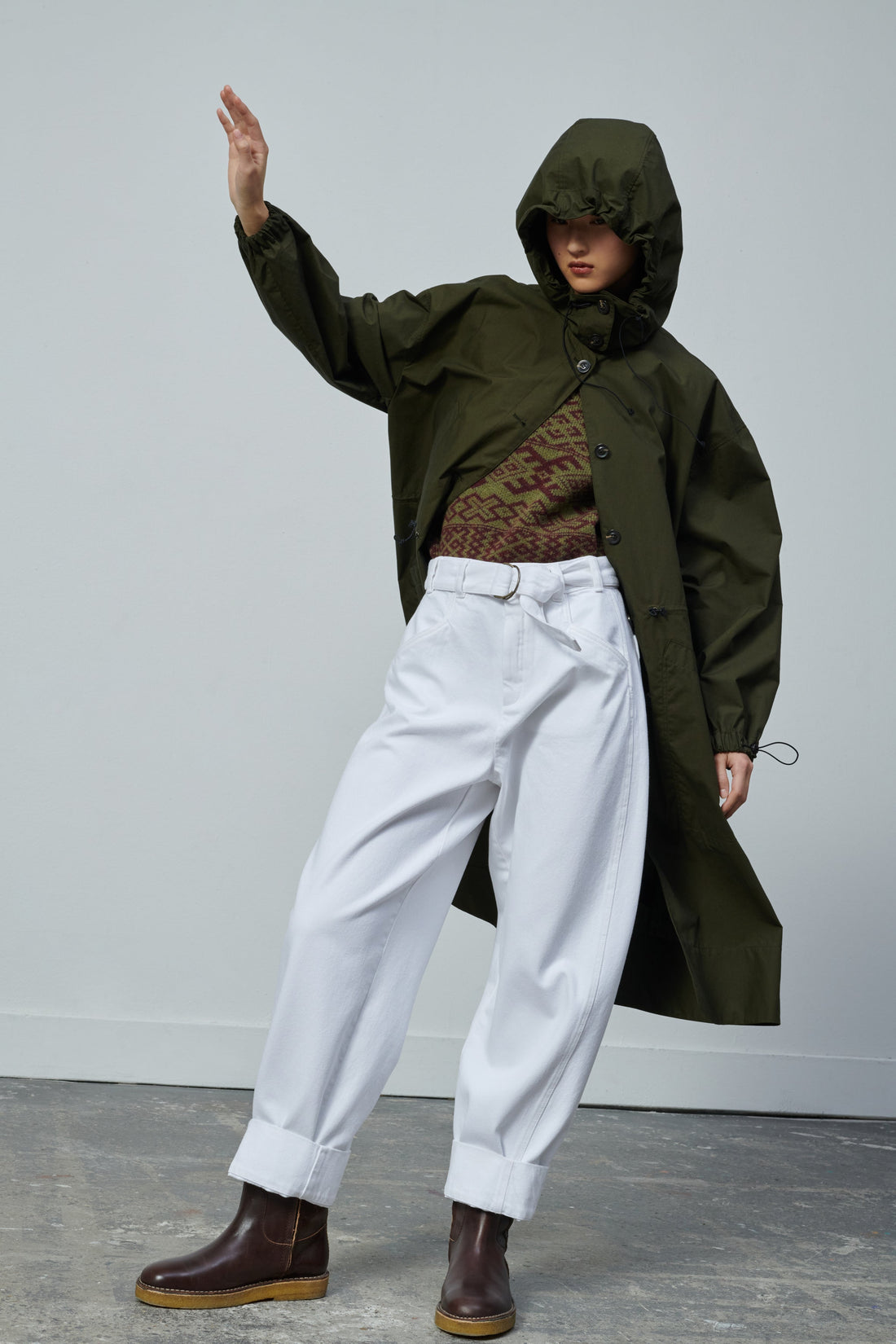 White denim high-waisted trousers - Slightly curved cut- Removable belt with double buckle- Two back patch pockets- Hook and loop fastener on the inside of the belt
