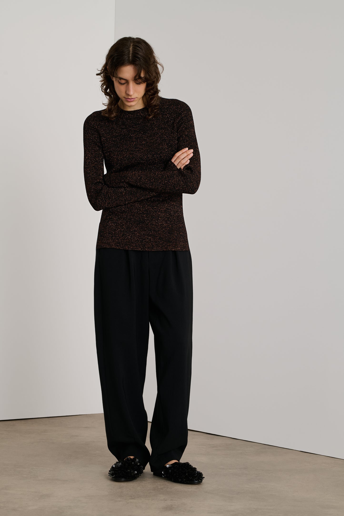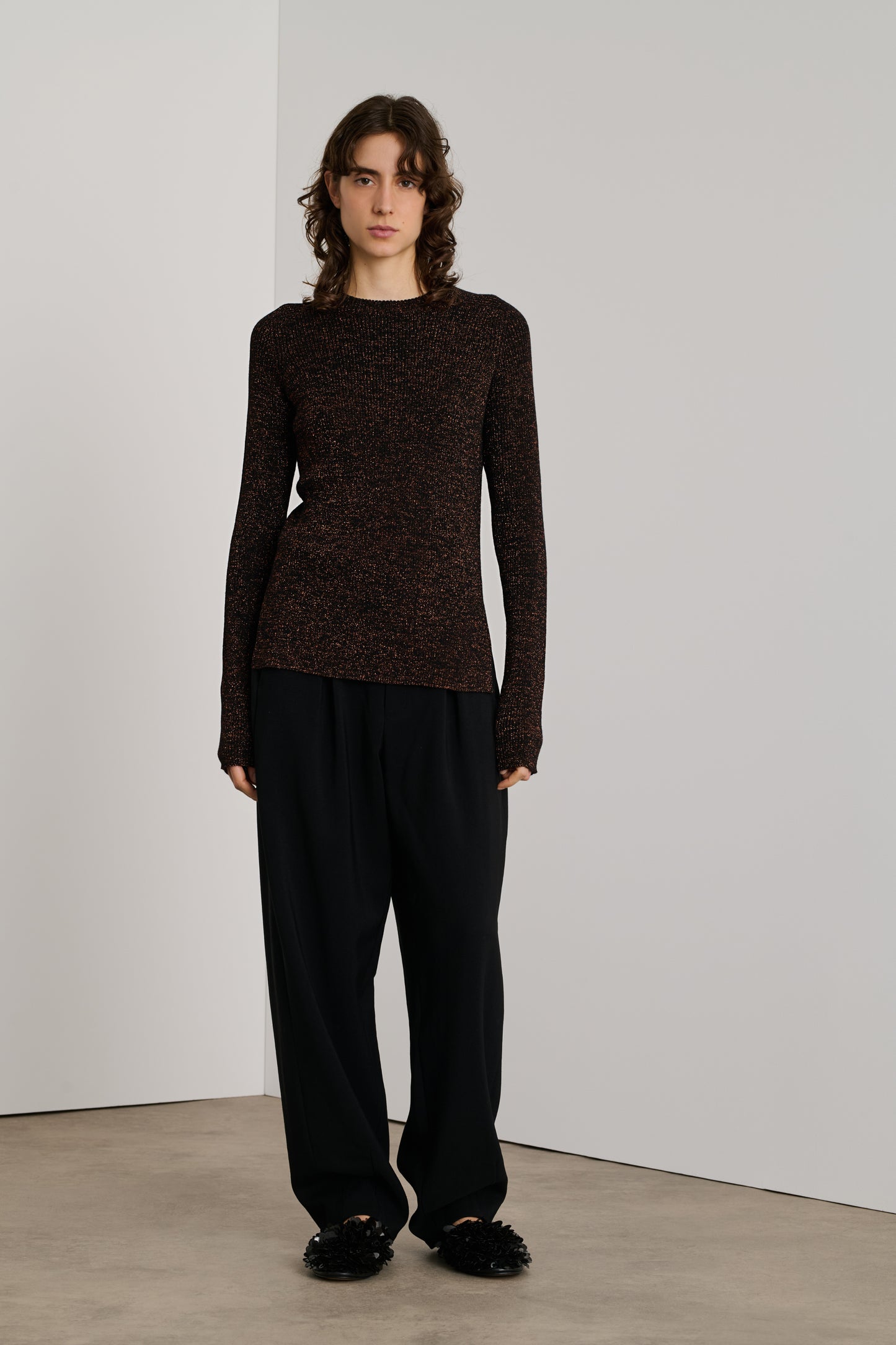 VERONA is a ribbed jumper knitted from merino wool yarn, mixed with lurex for an iridescent effect. It has a straight, close-fitting cut and a round neckline.